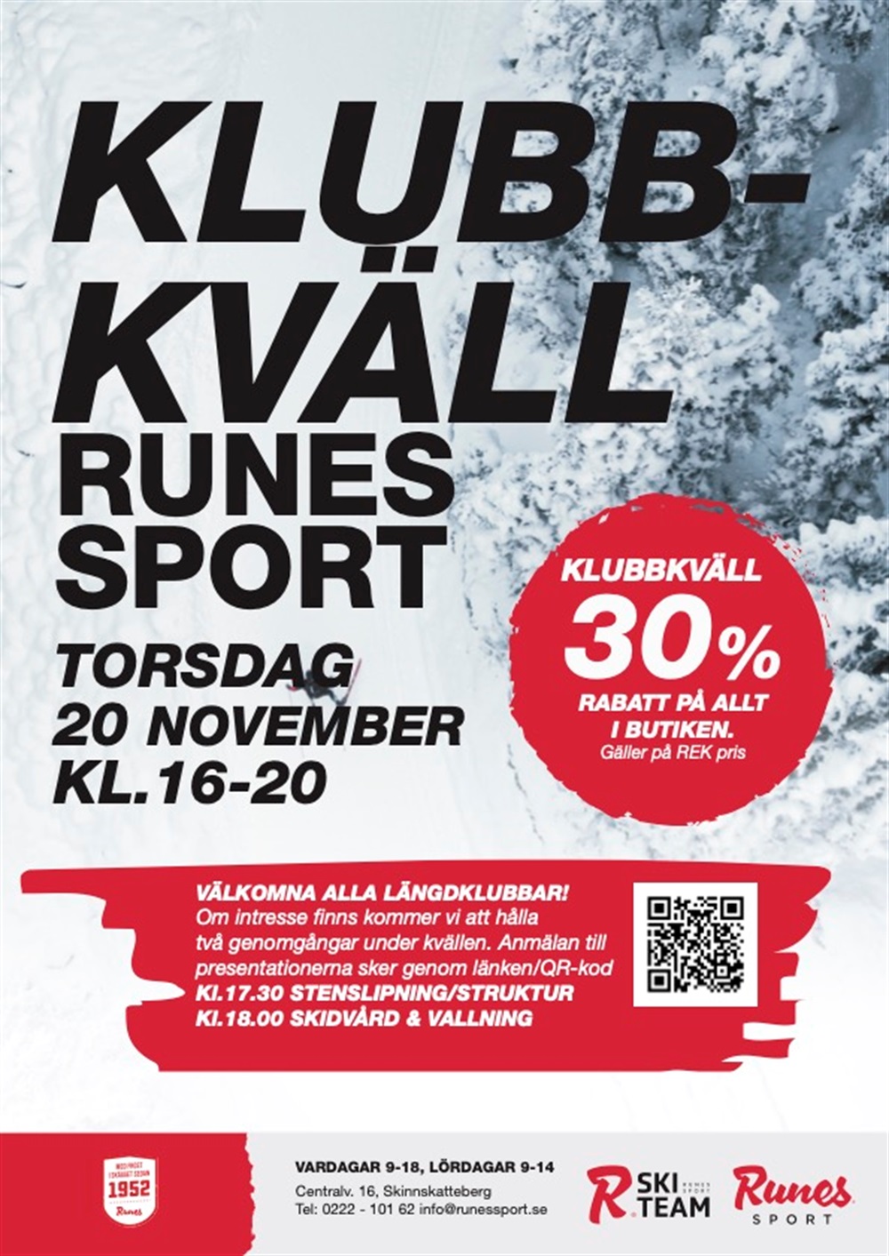Observera möjligheten att var med på genomgångar av stenslipning/struktur och skidvård/vallning. Anmäl till detta via QR koden.